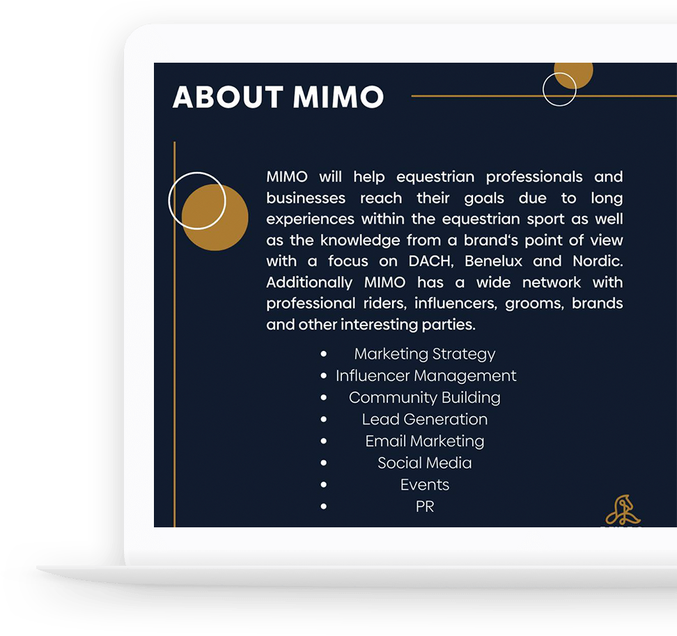 MIMO will help you to spread your message. If you need the face of your brand, a press release, sponsorships, influencers, or team up with other people in the equestrian world, MIMO will make that happen for you by